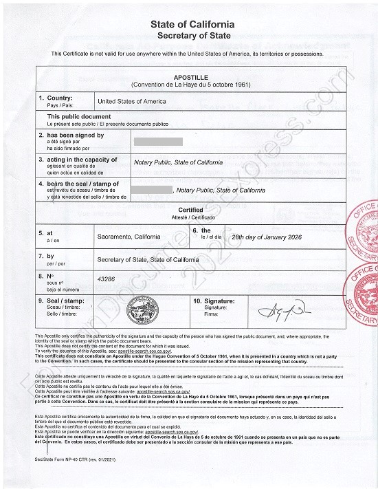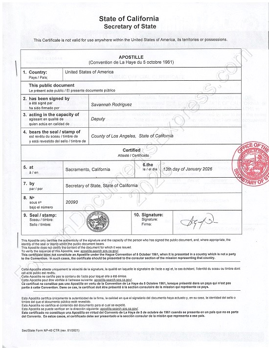 In the State of California, as in all U.S. states, an apostille is a separate page attached to the document by staples. It is signed by the California Secretary of State (facsimile signature) and has the Seal of the Office of the Secretary of State. California apostilles are issued in English/French/Spanish.