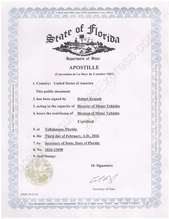 If you have a certified driving record issued by Florida Department of Highway Safety and Motor Vehicles, send it to us by email along with the Order Form and we will be happy to assist you with obtaining a Florida apostille.