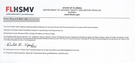 FLHSMV certifies the documents electronically. Driving records are certified and signed by the Director of the Division of Motorist Sevices, Department of Highway Safety and Motor Vehicles, State of Florida.