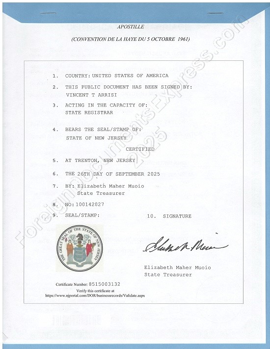 To be eligible for apostilles / legalization, certified copies of New Jersey marriage certificates must be issued by the Office of Vital Statistics of the NJ Department of Health in Trenton NJ, and certified by the State Registrar or Assistant State Registrar. These certificates are usually blue, green or burgundy in color.