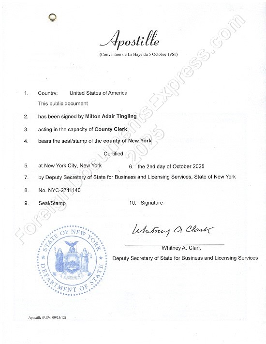 In the State of New York, as in all U.S. states, an apostille is a separate page attached to the document by an eyelet. It is signed by a Deputy Secretary of State (facsimile signature) and has a blue Seal of the Department of State of the State of New York.