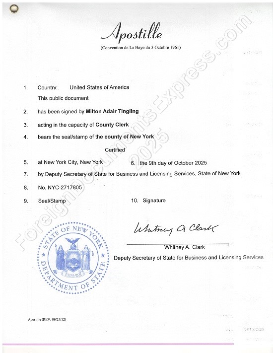 In the State of New York, as in all U.S. states, an apostille is a separate page attached to the document by an eyelet. It is signed by a Deputy Secretary of State (facsimile signature) and has a blue Seal of the Department of State of the State of New York.