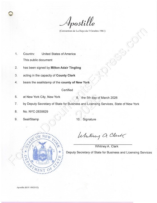 In the State of New York, as in all U.S. states, an apostille is a separate page attached to the document by an eyelet. It is signed by a Deputy Secretary of State (facsimile signature) and has a blue Seal of the Department of State of the State of New York.